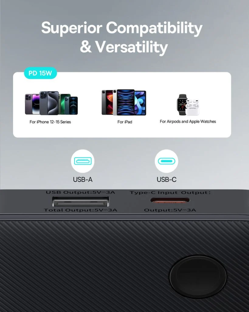 بفضل سعة البطارية التي تصل إلى 10000 مللي أمبير في الساعة، يوفر باور بانك Baseus Airpow Lite طاقة كافية لإعادة شحن هاتفك عدة مرات. يمكنك استخدامه بأمان طوال اليوم دون القلق بشأن نفاد البطارية. بالإضافة إلى ذلك، يدعم هذا المنتج تقنية الشحن السريع بقدرة 15 واط، مما يساعد على توفير وقت الشحن ويضمن شحن جهازك بالكامل بسرعة.