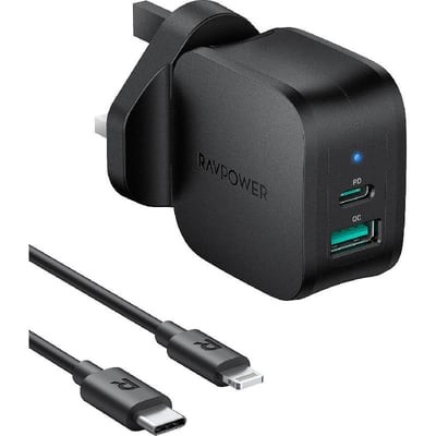 كبيرشاحن راف باور جداري بتقنية PD مخرجين أسود مع كيبل لايتننج تايب سي أبل